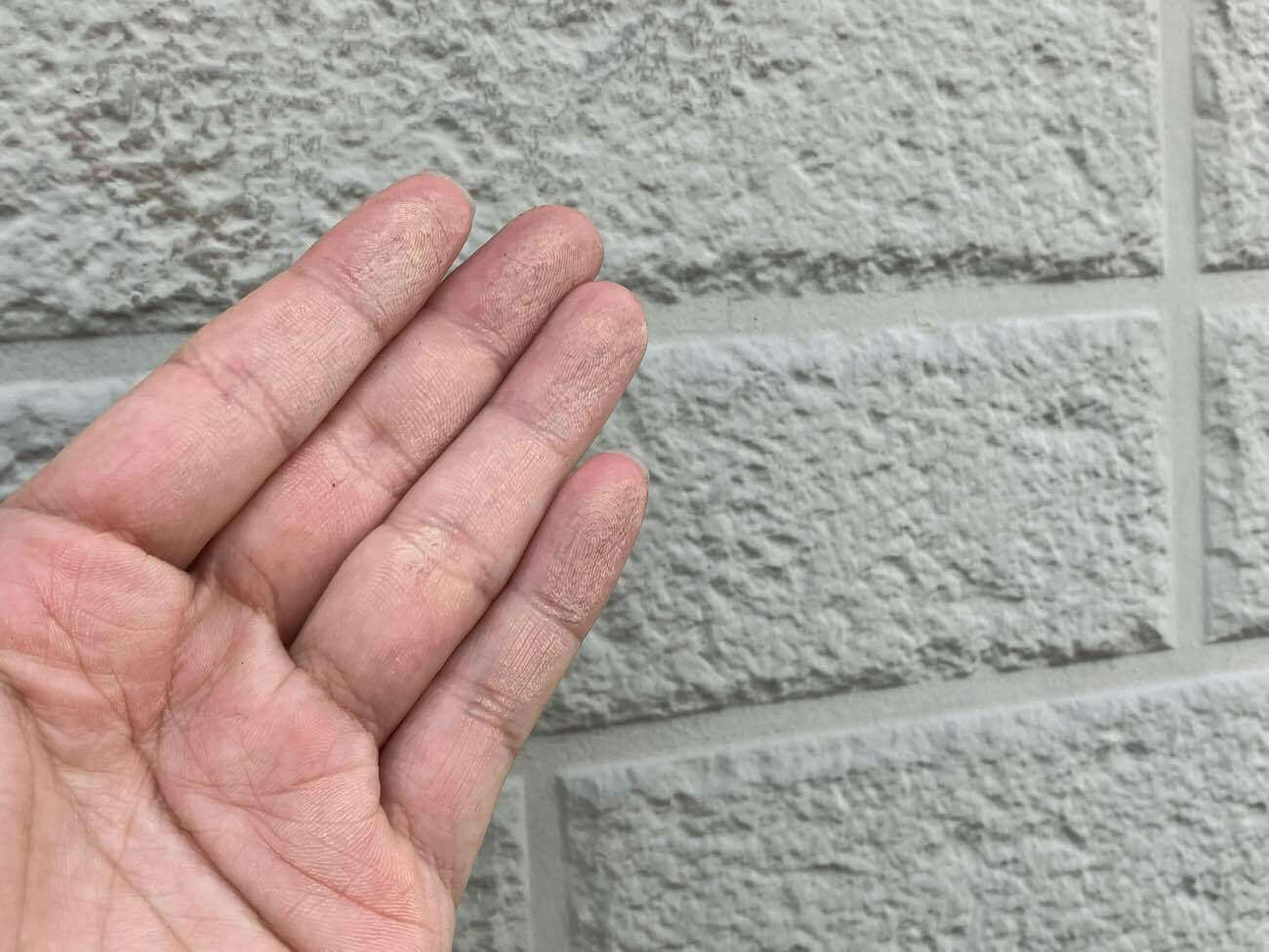外壁の状態はチョーキング現象と呼ばれる紫外線や雨風で塗膜が劣化し、顔料が白い粉状になって表面に現れる現象が見られます。