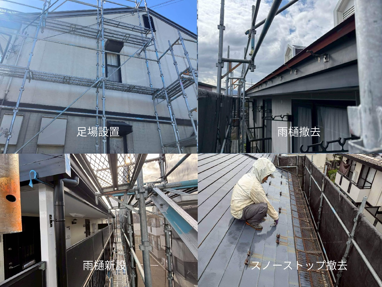 足場設置→既存雨樋撤去→雨樋新設→既存スノーストップ撤去と進めて参ります。
