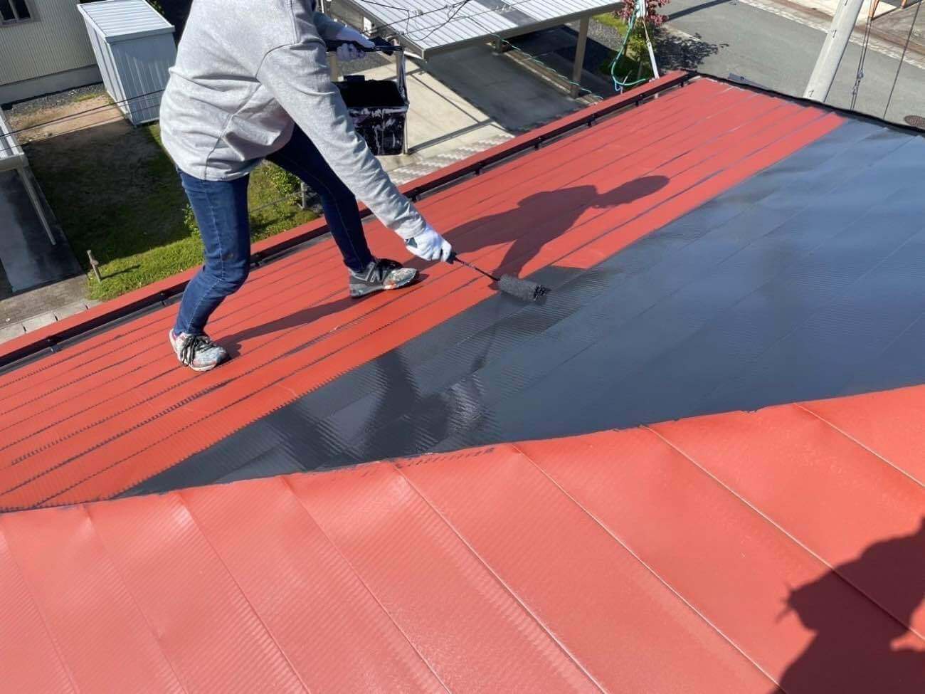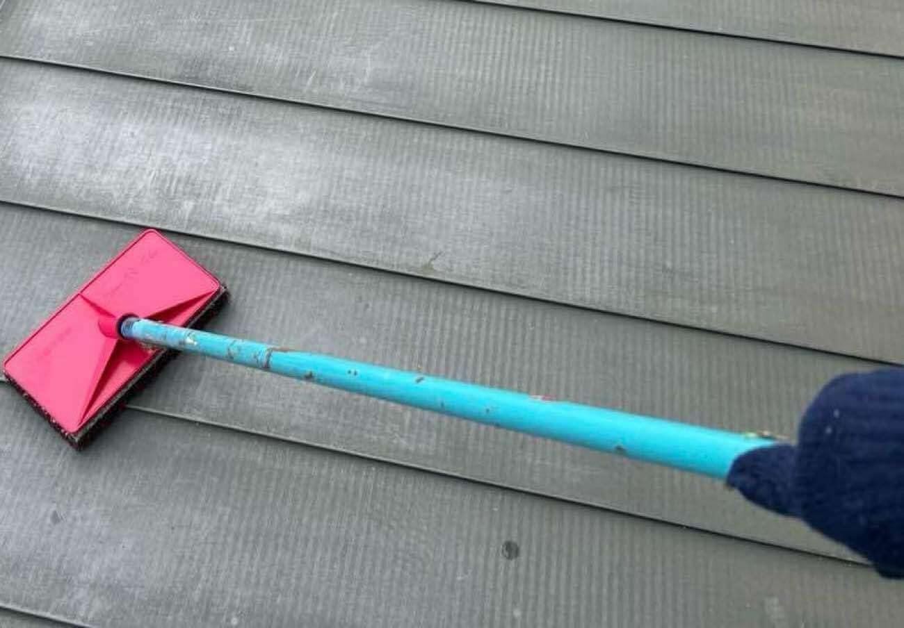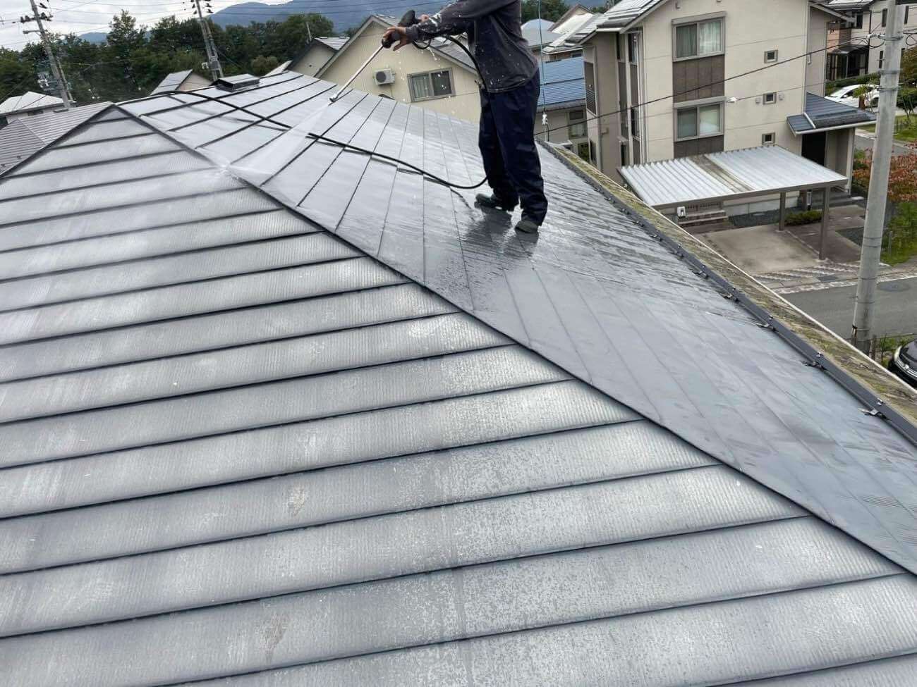 まず始めに高圧洗浄で塗装前に屋根の汚れ、コケ、チョーキング(粉状の塗膜)、古い塗膜などを高圧の水で洗い流していきます。塗装を長持ちさせるために欠かせない下地処理作業です!
