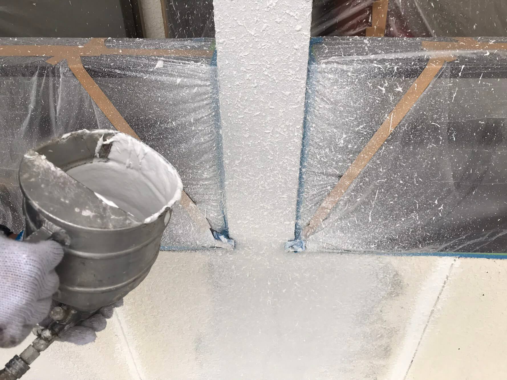 仕様は微弾性フィラーでマスチックと呼ばれるさざ波模様の厚付け仕上げで、今後起こりうるひび割れにも追従できるようにしました。