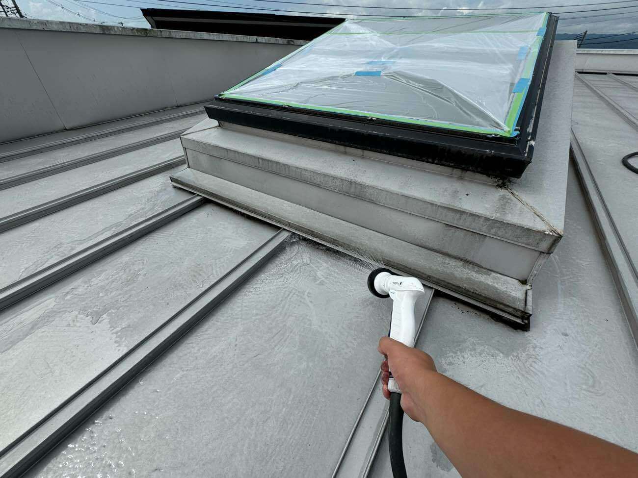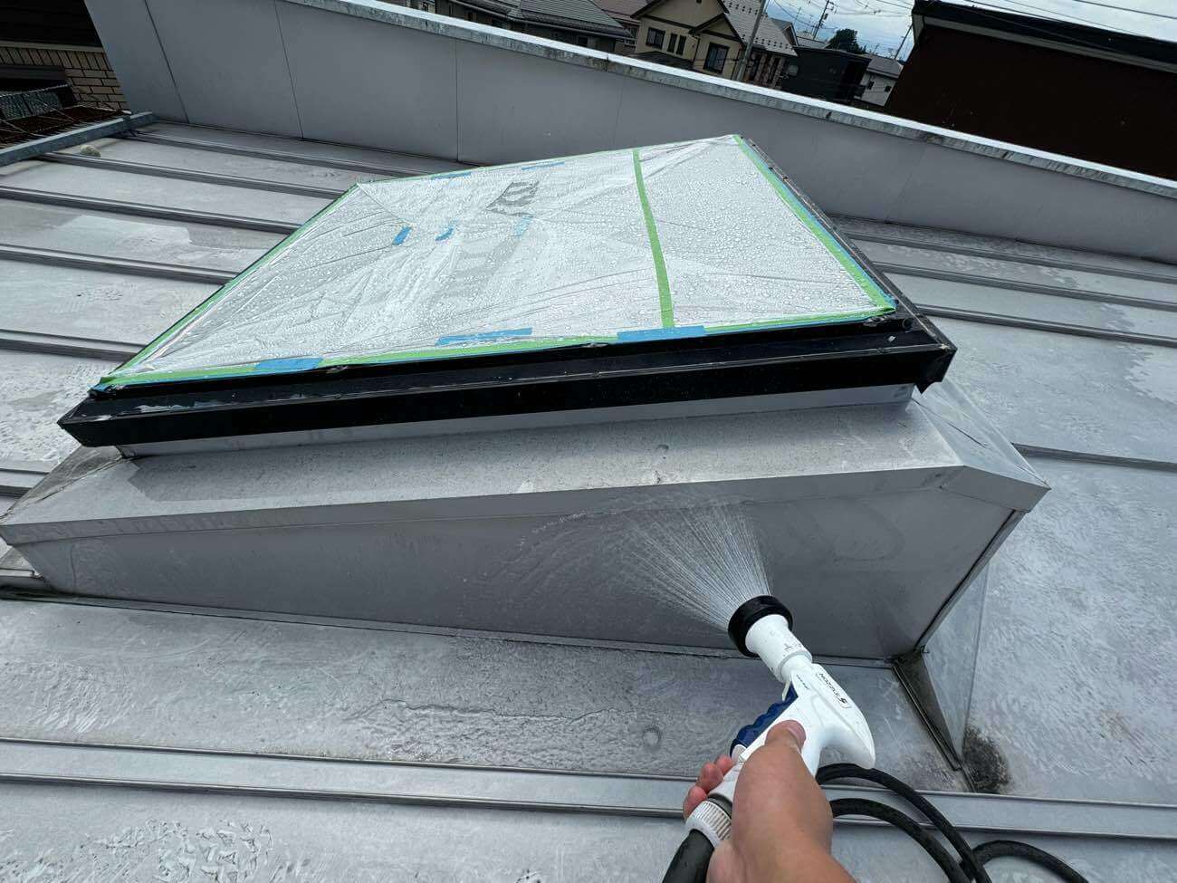 まずはトップライトと屋根の取合い部に一定時間散水を行いましたが、浸入水は確認できませんでした。