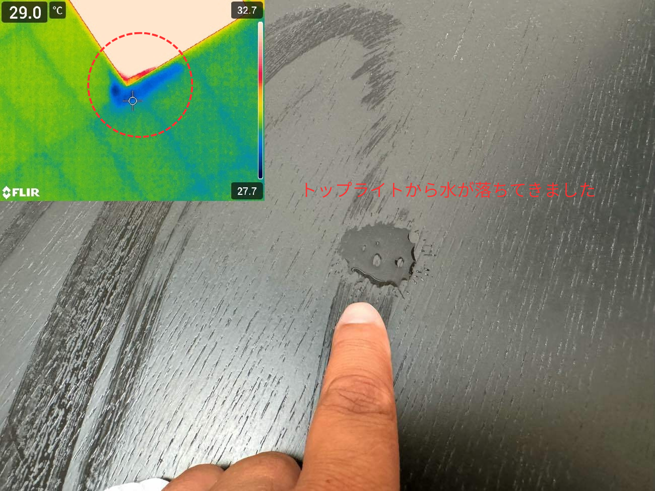 11箇所の中で侵入水を確認できたのは側面の板金部分になります。一定時間散水を行なったところ、室内のテーブルに雨水が落ちてきました。