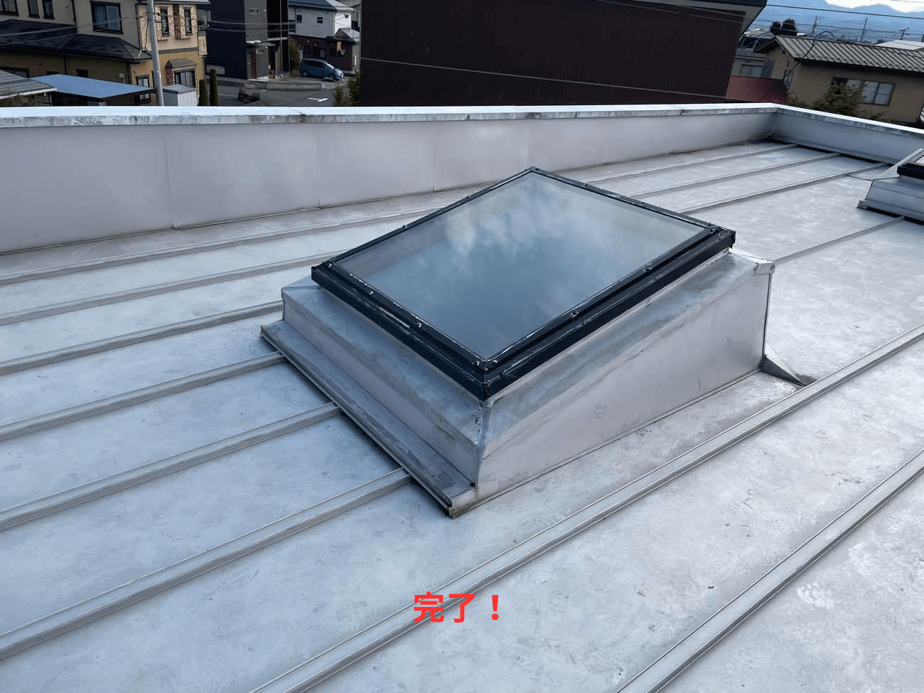 既存のトップライトを再設置することはトップライト自体に歪みが生じてしまい、これも雨漏りの原因になりますので、新しいものを設置させていただきます。