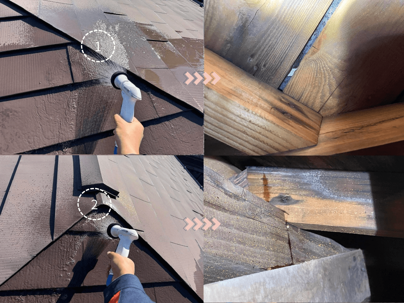 ◆雨漏り調査・・・現地調査より散水箇所を絞ります! ①~②へと進めて行きます。