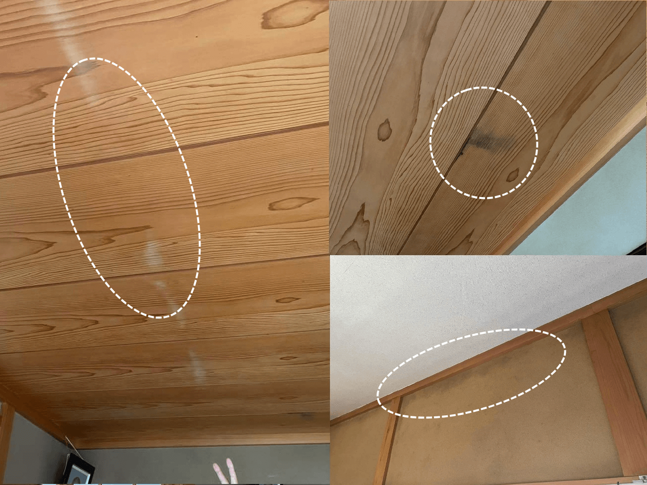 屋根、外壁の傷み、天井・壁のシミやカビ、漏水、雨どいの破損など様々な症状を見ます。