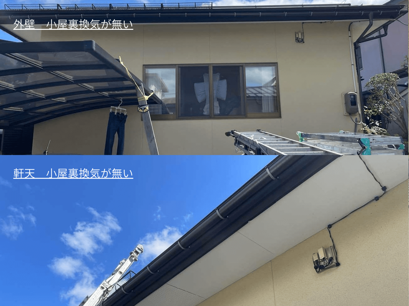 外壁は小屋裏換気が使えている箇所ががなく、天井と屋根の間の空間に溜まる熱気や湿気を、外気を取り入れて排出する仕組みがとられていないようです。