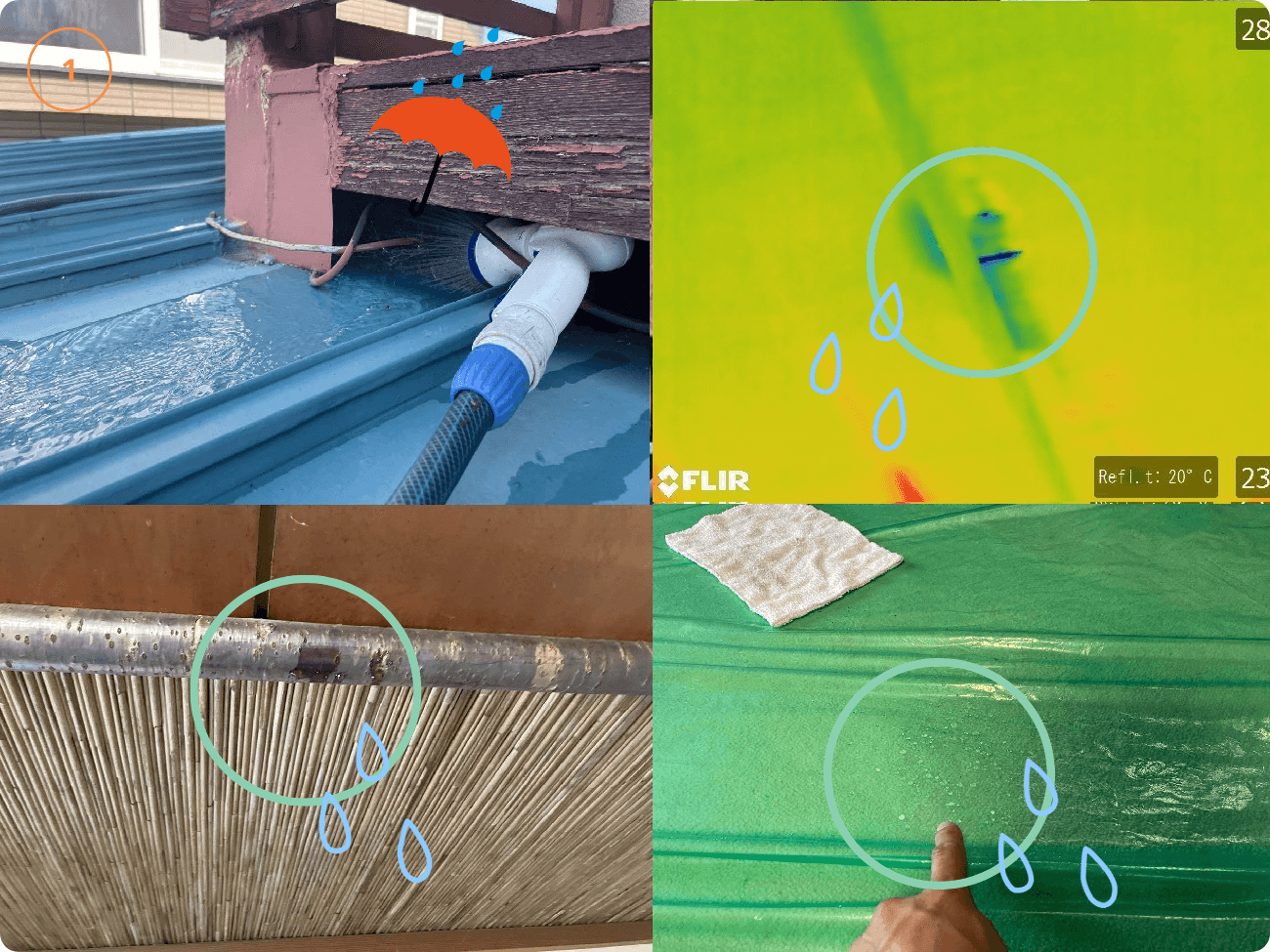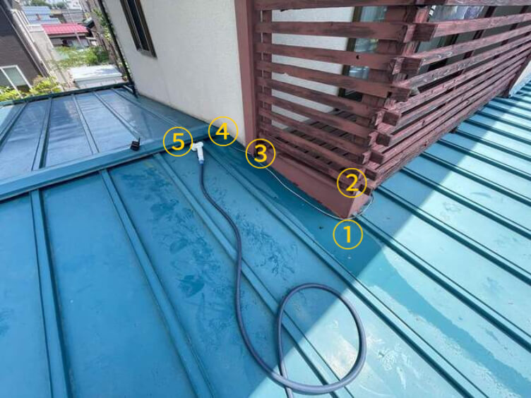 写真の①~⑤の番号順に散水していきますが、結果はなんと、、すべての箇所より浸入水が確認できました。