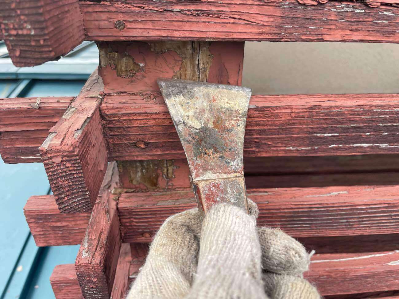 続いて付け柱の木部ケレンをし塗装前に表面を整えておきます。続いて木部同士を接続している板金部分の隙間をパテで埋めていきます!