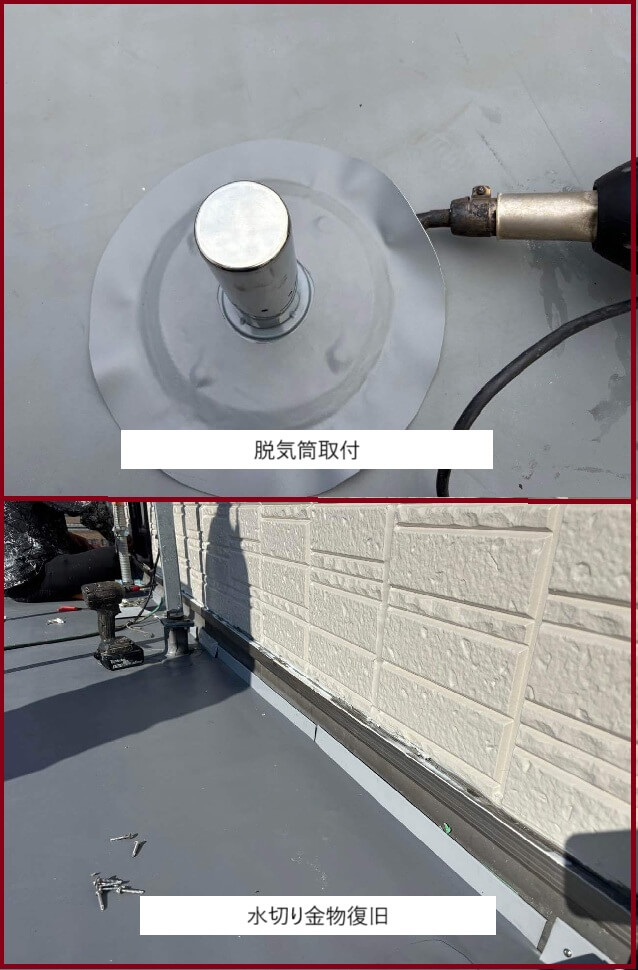 脱気筒を取り付け、屋上の防水層と下地の間に発生した水蒸気を外に逃がすための筒のことです。これは、水蒸気が原因で防水層に膨らみや亀裂が生じるのを防ぎ、雨漏りを防止する重要な役割を担い絶縁シートでたまった水蒸気がこちらから出るわけですね!