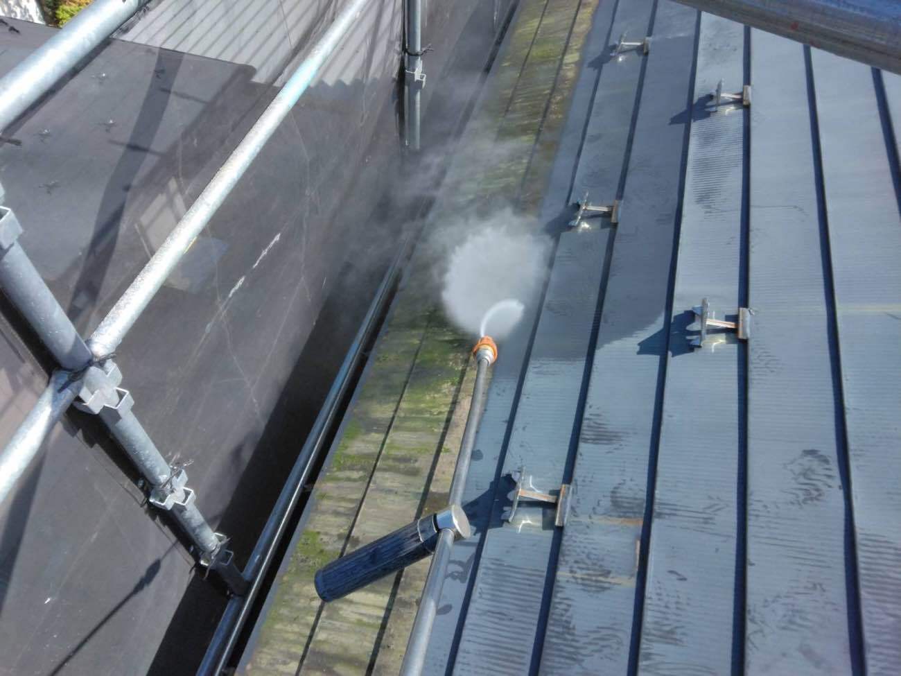 次はスノーストップ脱着後、高圧洗浄でしっかり表面の汚れやカビ、劣化塗膜を徹底的に除去していきます!