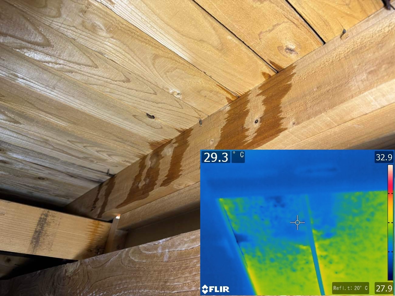 ④は、トップライト上部の板金材に散水を行いました。こちらは浸入水は確認出来ませんでしたが、側面のつかみ部分に散水をしたところ、複数箇所に浸入水を確認しました。元々雨染みのあった箇所に赤外線カメラで反応もでてきました!