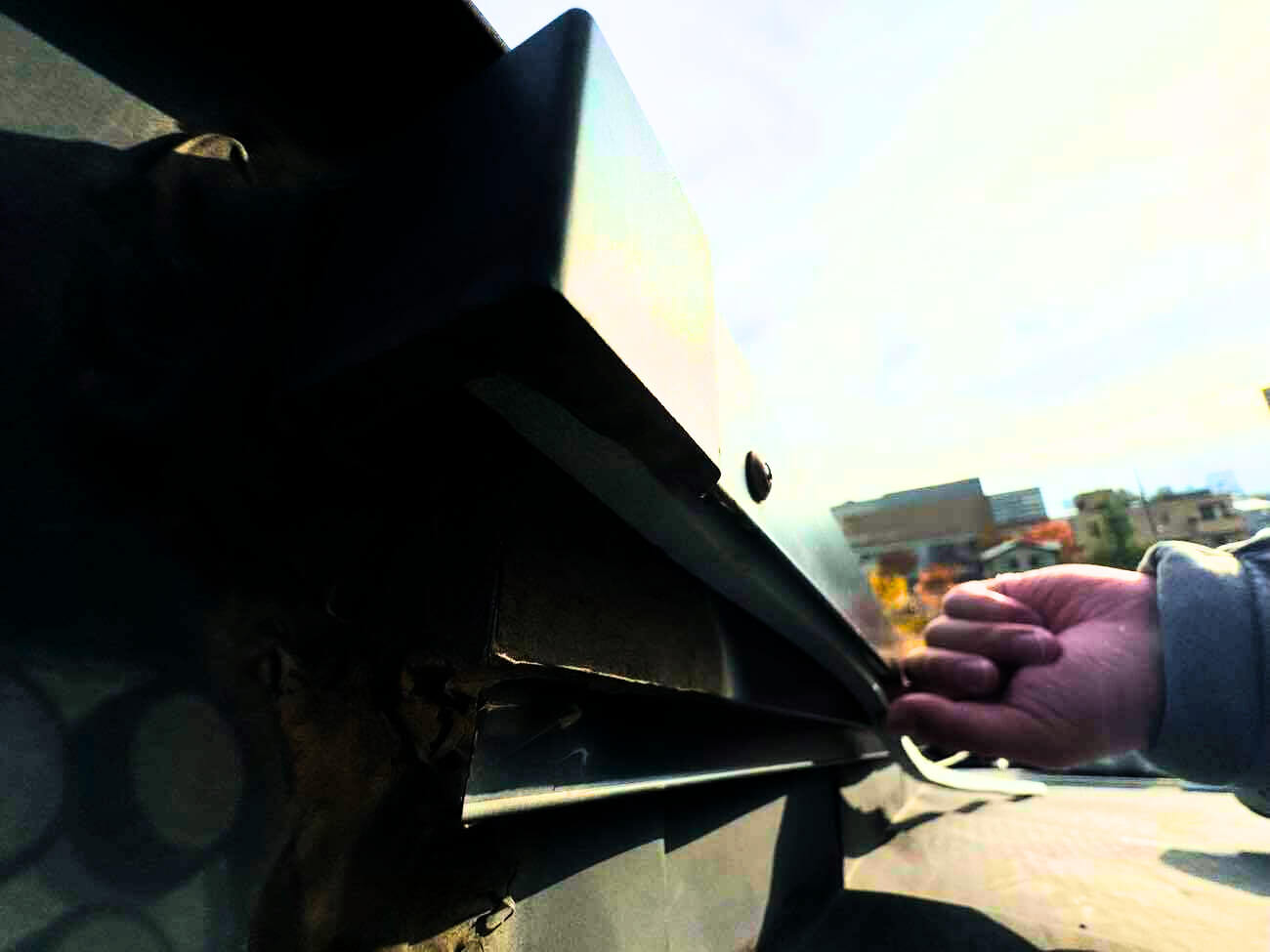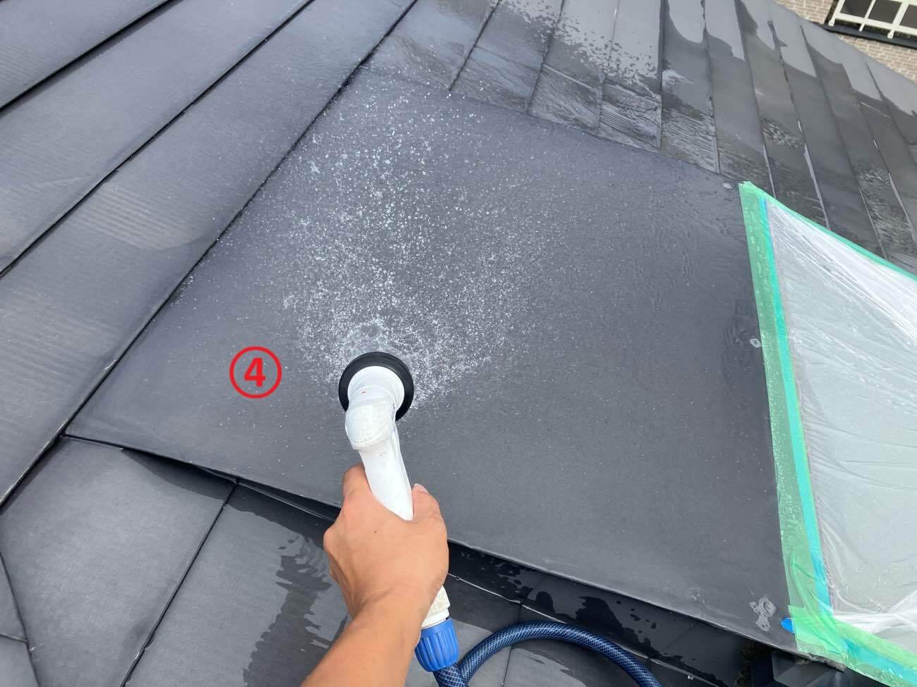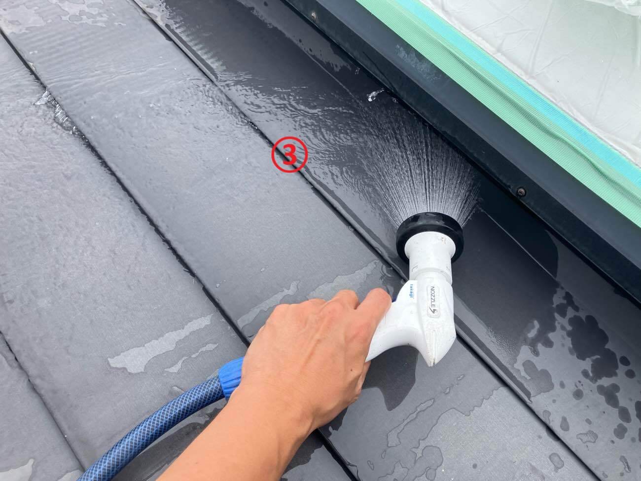 ③はトップライトと立ち上がりの屋根板金との取り合いに散水を行いました。風の吹込みを想定し、下からあおりで掛けたところ、トップライトの周りから、複数箇所に浸入水を確認しました。