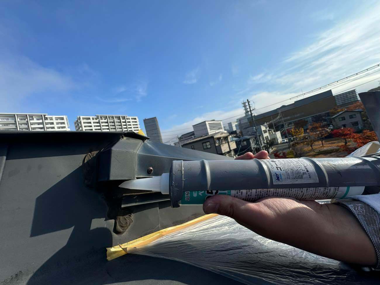 ガラス面にもシーリング充填し、最後は防水テープを貼り完了です!