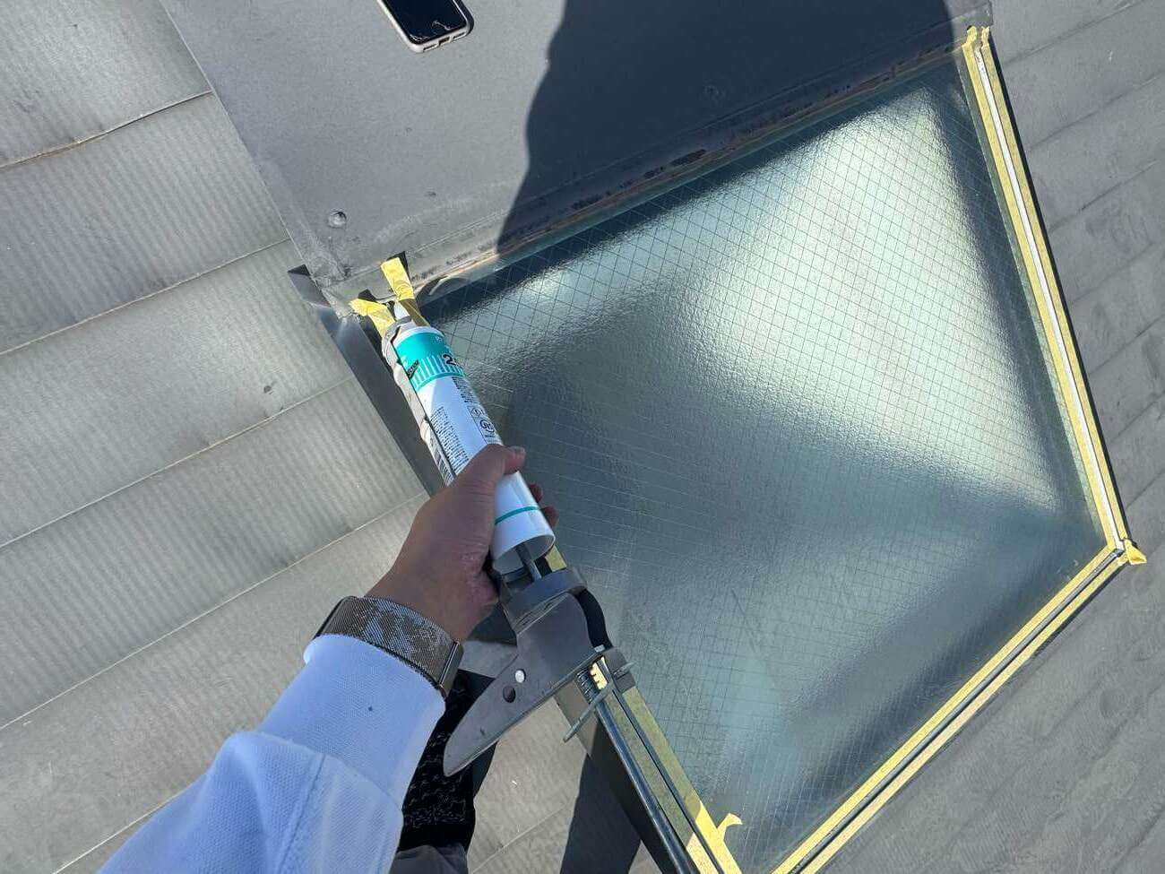 今回はトップライトの応急処置をご希望ということで進めてまいります!太陽の紫外線や熱、風雨に常にさらされているため、防水材が劣化し、ひび割れや硬化を起こしているようです。これが雨漏りの最も一般的な原因です。