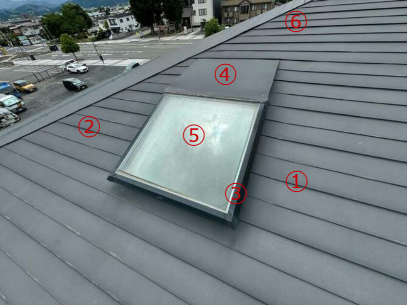 目視で異常は確認できませんが、調査箇所をトップライトの①~➅に絞り、各一定時間散水を行い、赤外線カメラ使用して雨漏り箇所を特定していきます!