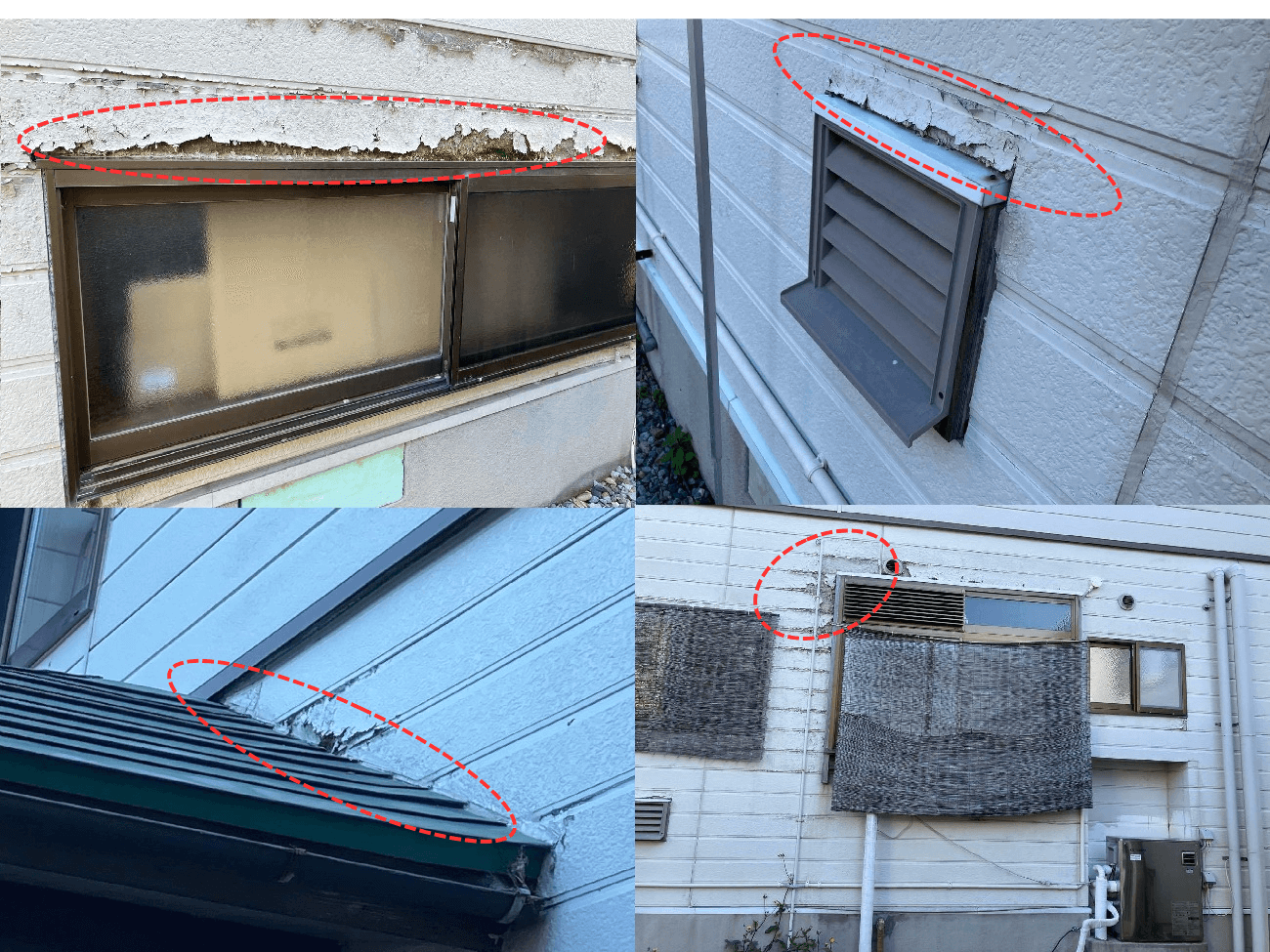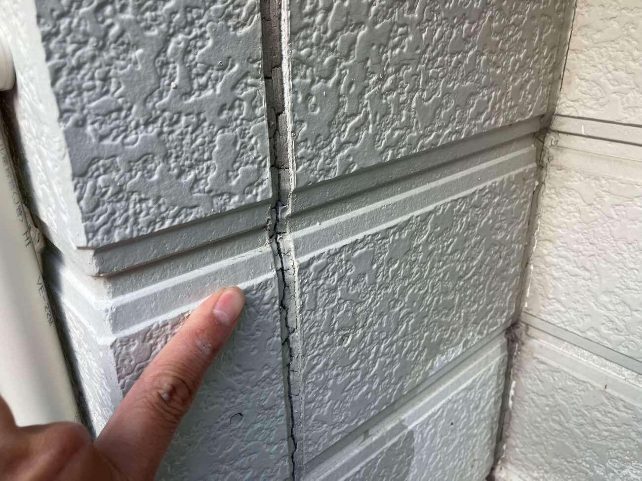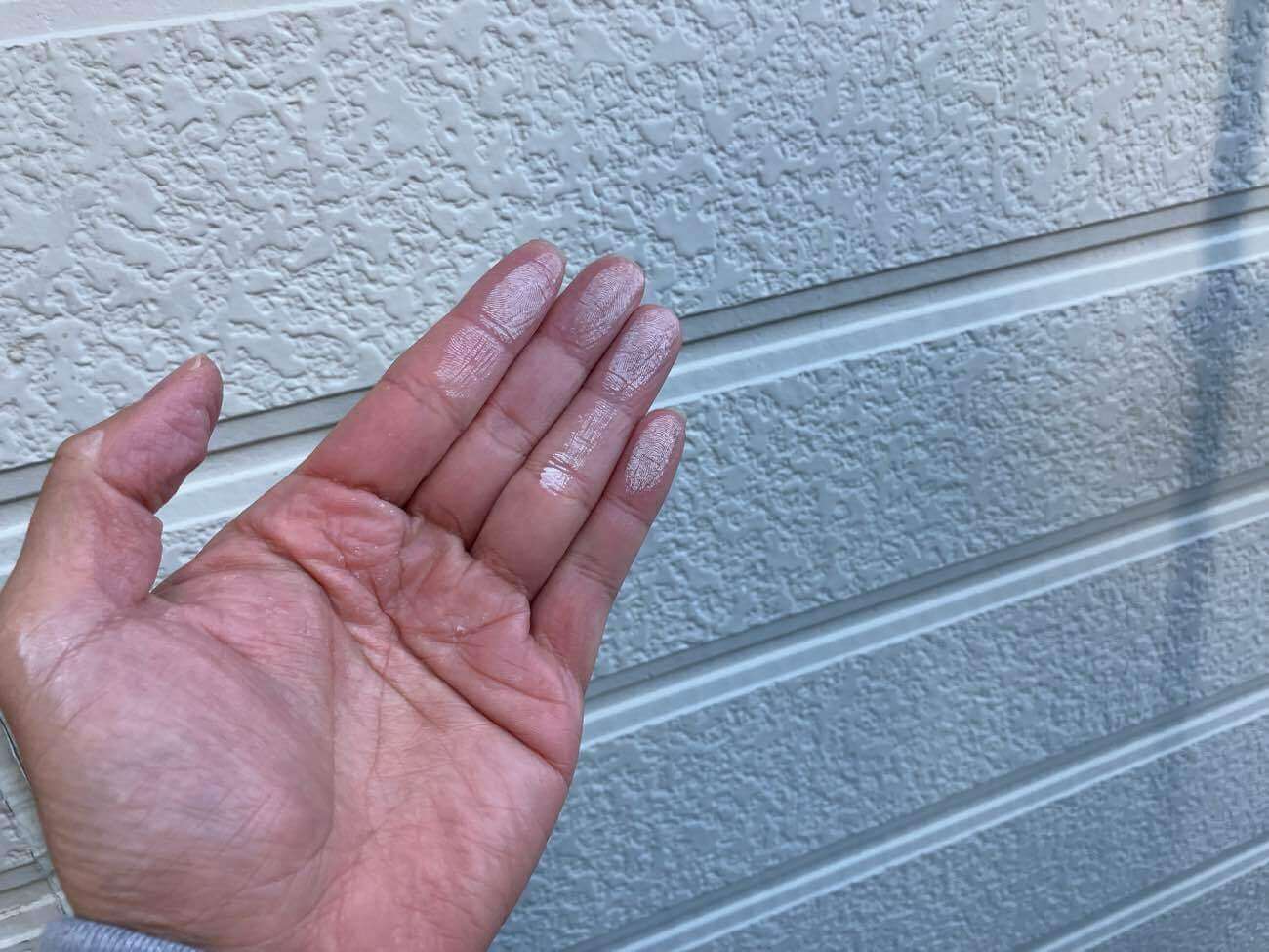 また、他の箇所の外壁には剥がれはほとんど見られませんでしたが、全体的に手で触りますと白くなりました。こちらはチョーキングという現象で、外壁の塗膜が劣化していると見られます。他にはシーリングにひび割れも見られました。このような箇所からも雨水が内部に侵入し、雨漏りや外壁下地の劣化に繋がることがあります。
