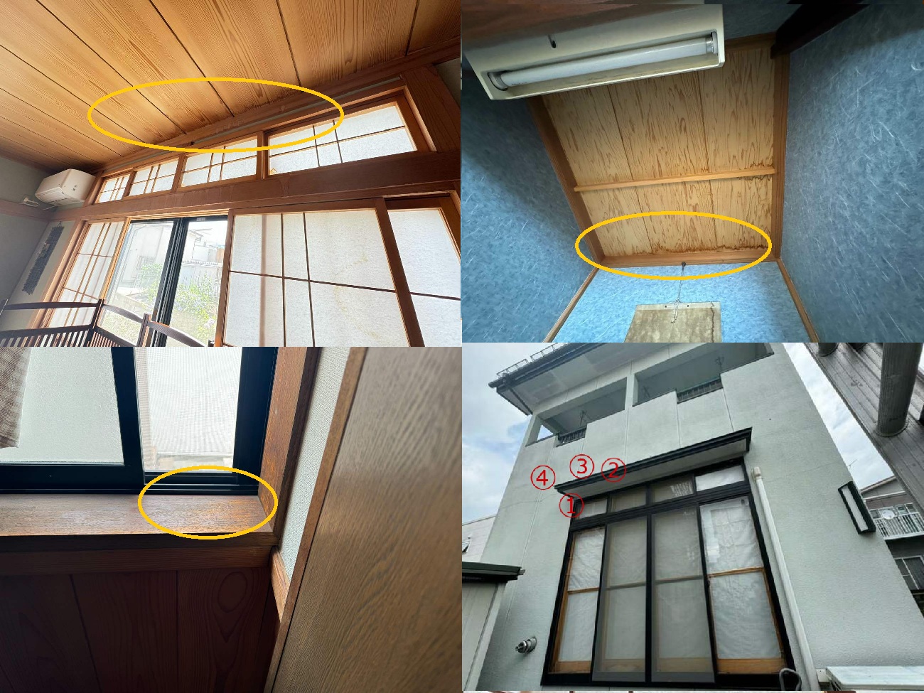 ○で囲った部分には浸入水または結露で濡れていた跡があり、こちらの周辺に絞って散水調査を行います!
