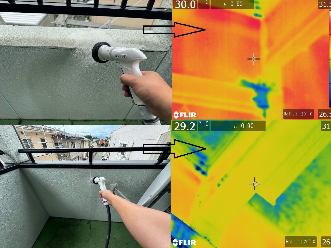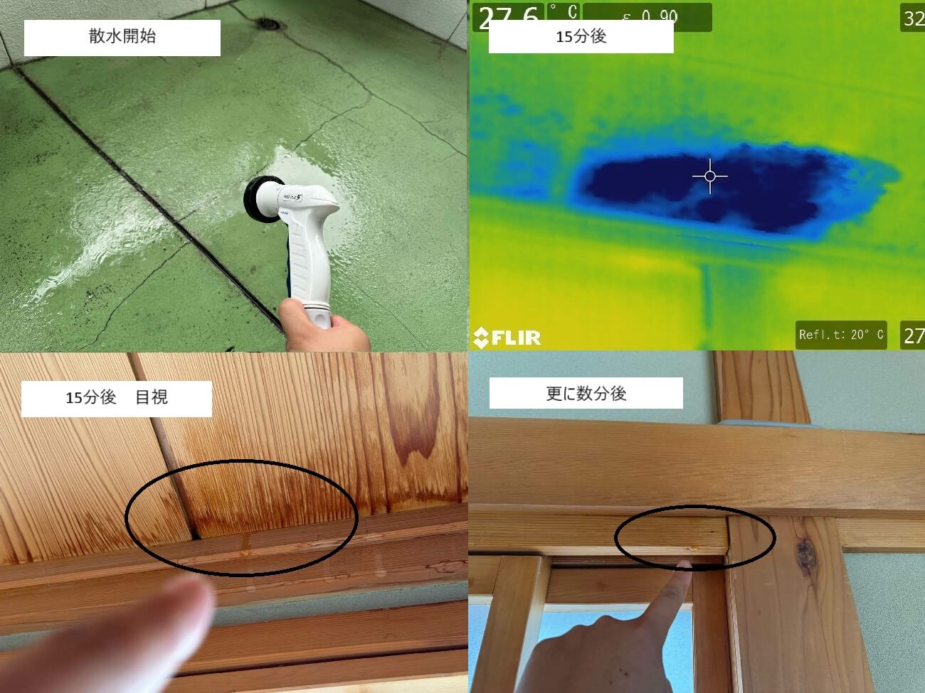 他、外壁の誘発目地のひび割れや庇屋根とサッシの間に走っている、ひび割れにも散水しましたが浸入水は確認できませんでした。