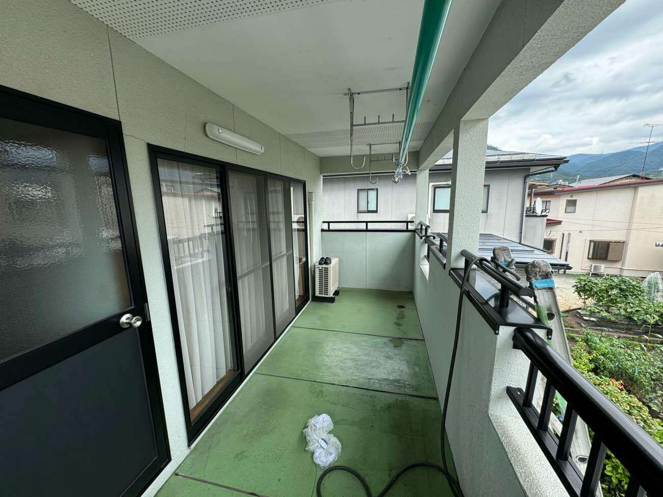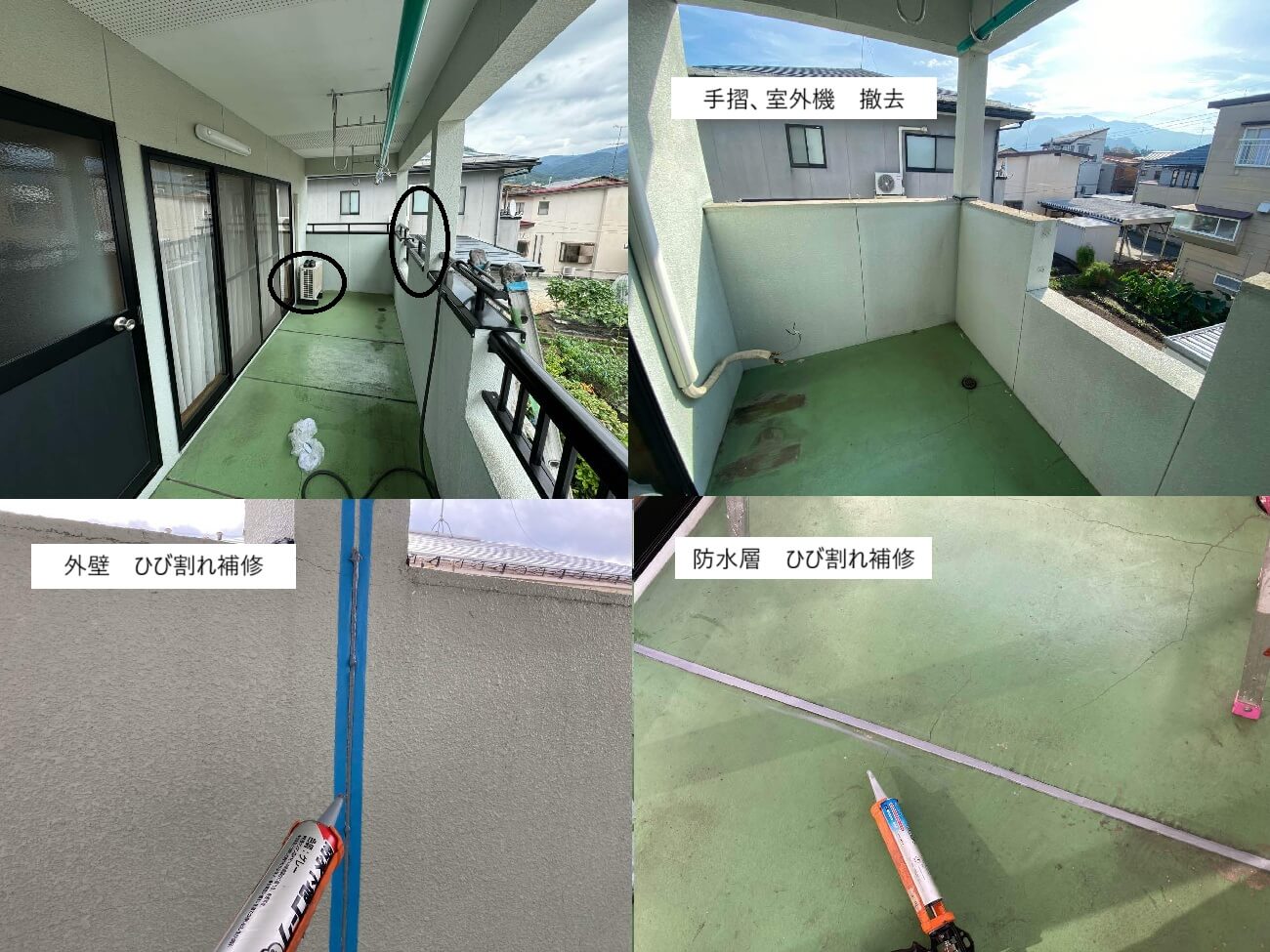 手摺笠木は脱着し、天端の雨仕舞い後に戻します。室外機も脱着します。