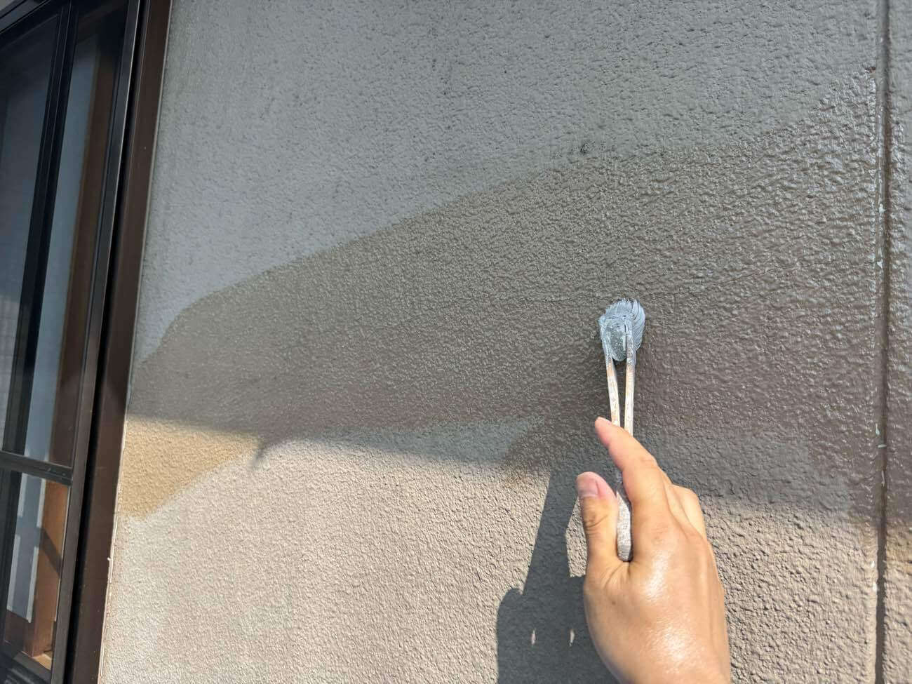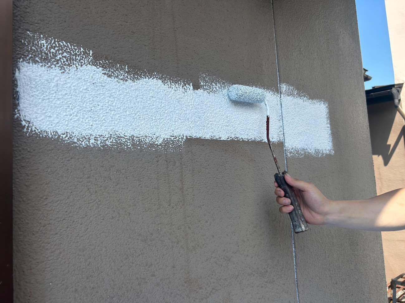 プライマー塗布していき、吸水性の高い素材の外壁には塗料が吸い込まれるのを防ぎ、上塗り塗料の吸い込みを均一にすることで、塗りムラを防ぎます。