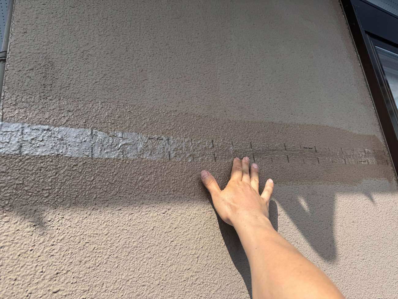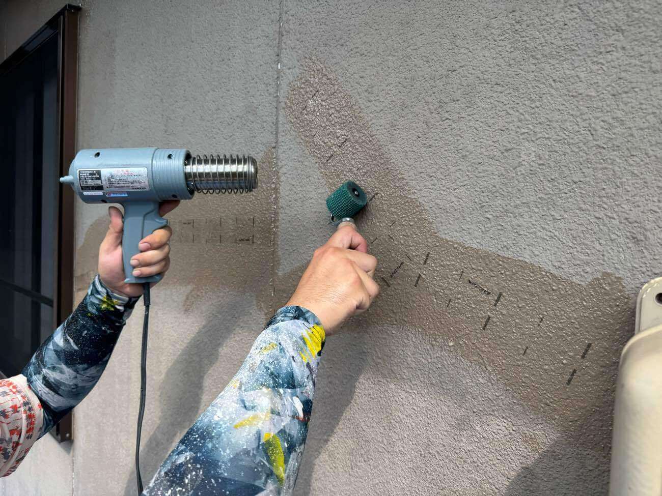 補修部分は周囲の外壁と馴染むように、元の壁の「模様(凹凸や柄)」を再現する外壁の「パターン付け」をしていき、その後、全体を下塗りします。