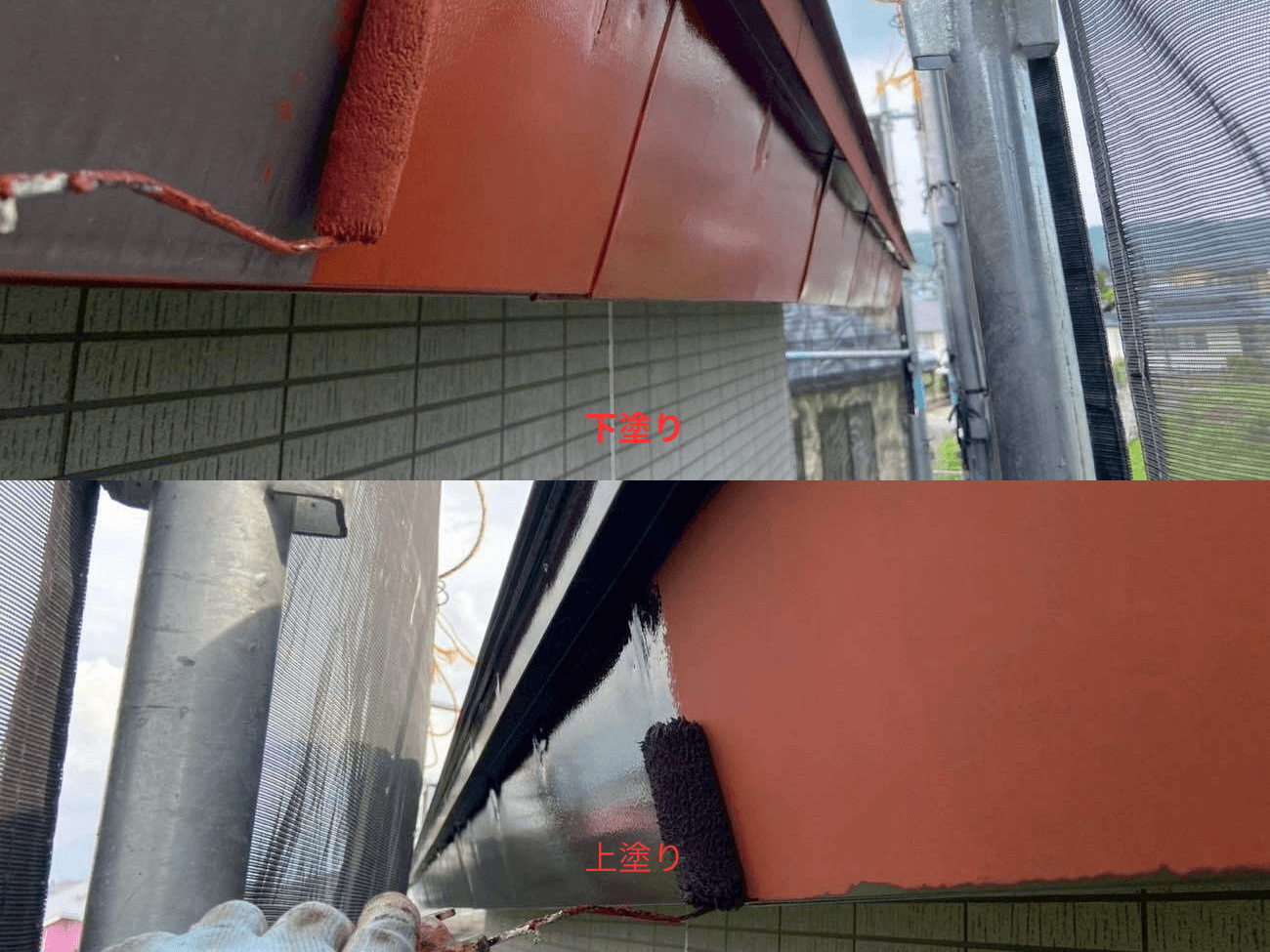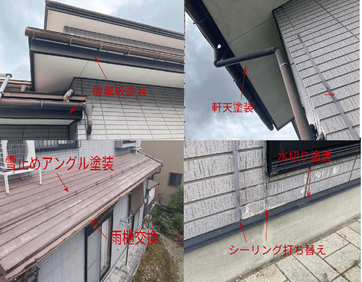 全体の様子を拝見させていただき、屋根・外壁の塗装に加えて、軒天、破風板塗装、水切塗装、雪止めアングルなど錆や湿気による黒ずみが気になる箇所も塗装をおすすめさせていただきました。