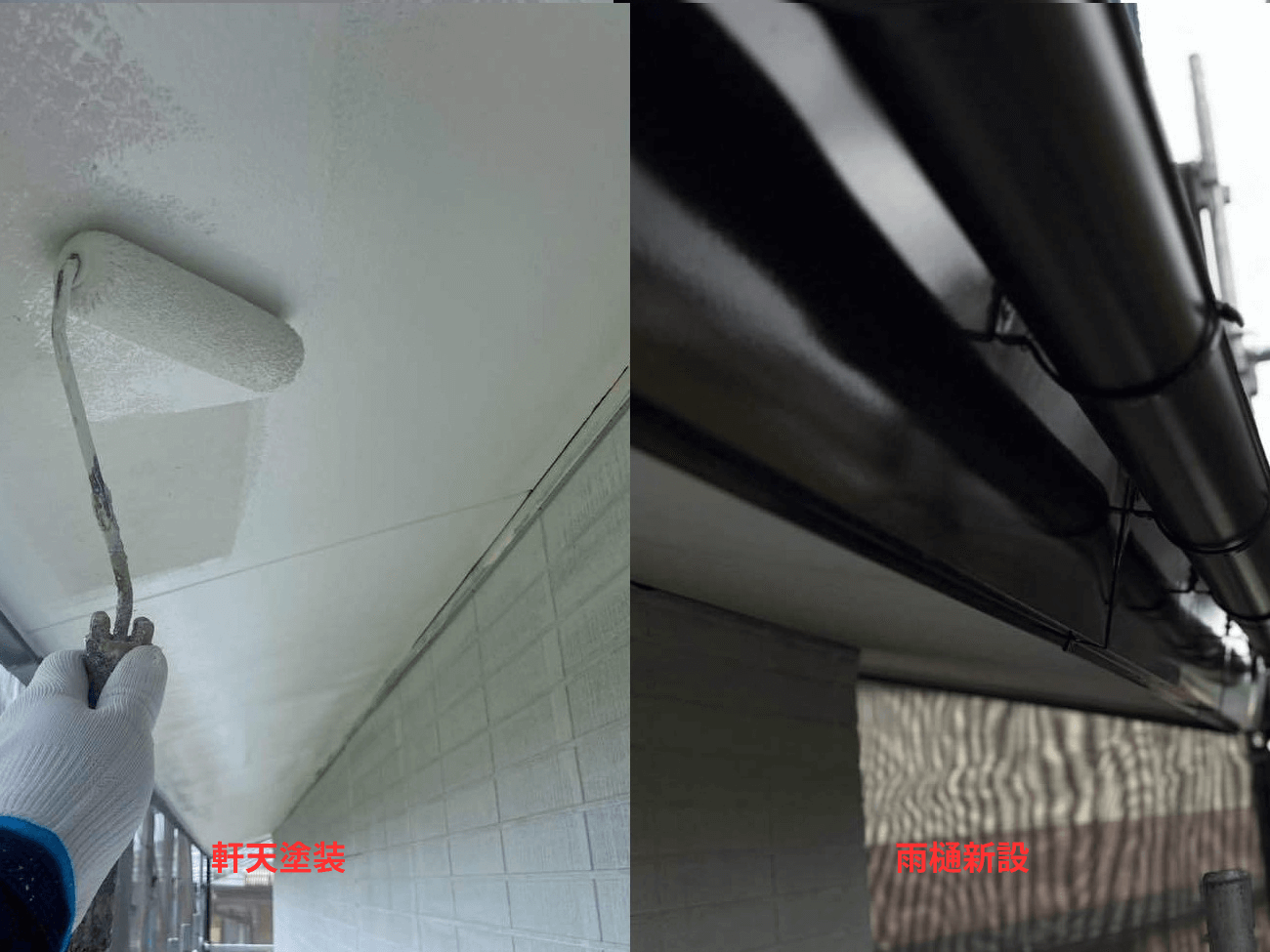 軒天塗装と水切りを塗装し、雨樋新設します!