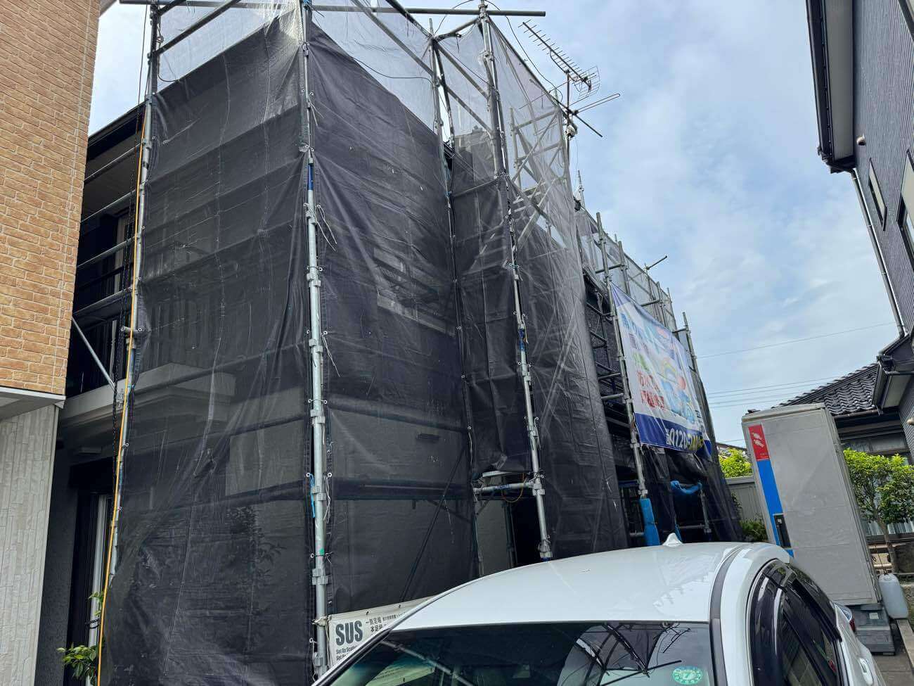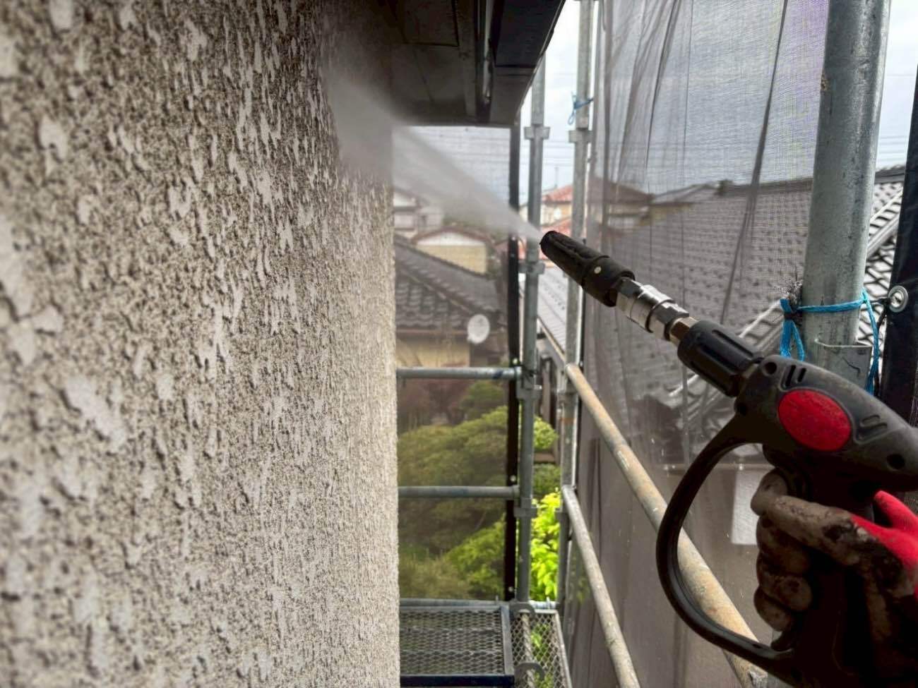 では先ずは足場を設置し、高圧洗浄で外壁の汚れや古い塗膜を洗い流して塗装の下処理をしていきます。
